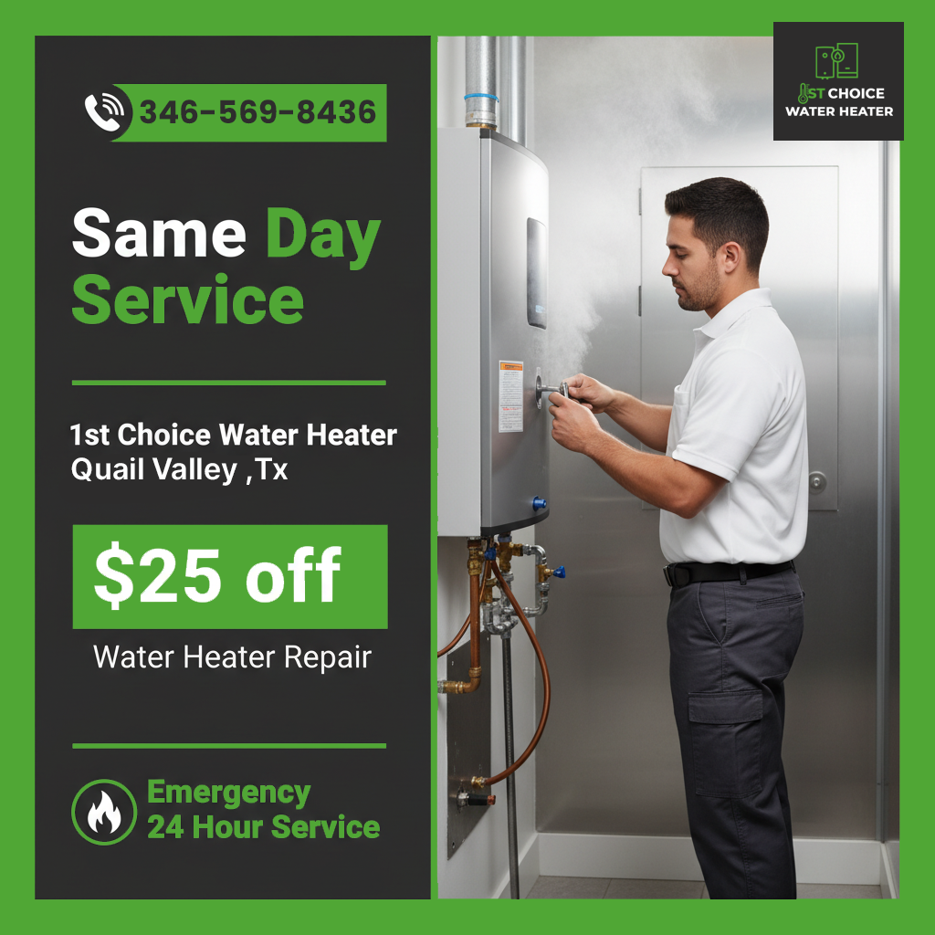 1st Choice Water Heater Quail Valley TX calms it down. We fix, fit and swap out gas, electric and tankless systems keeping your showers warm and your mornings drama free.